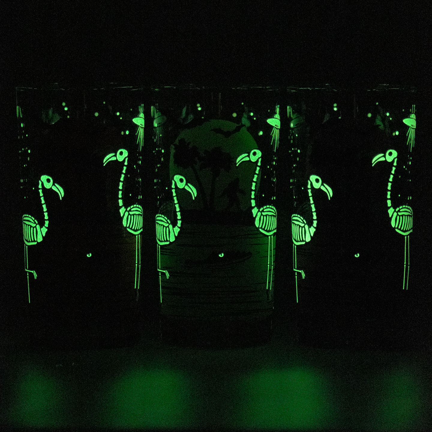 Unleash your inner swamp ape and go Trick-or-Treating through the mysterious Everglades. rocks glasses feature a Florida swamp scene with glow-in-the-dark skeleton flamingos, a UFO, lurking swamp monsters, and many more creepy crawlies! But don't let their haunting appearance fool you – Atomic Drinkware is made to withstand both supernatural encounters and everyday use. Whether you're enjoying a ghoulishly good cocktail or simply quenching your thirst after a long day of haunting, these Eerie Everglades Rocks glasses are as eerie as they come! Also available in Collins size.
